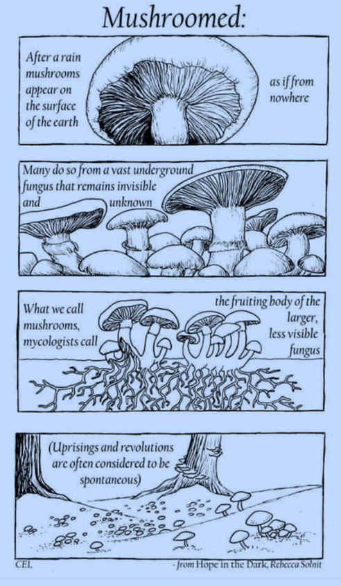 And then I came across the mushroom idea again, in the book I was reading. In Hope in the Dark, Rebecca Solnit includes an image that captured this idea in relation to uprisings and revolutions.